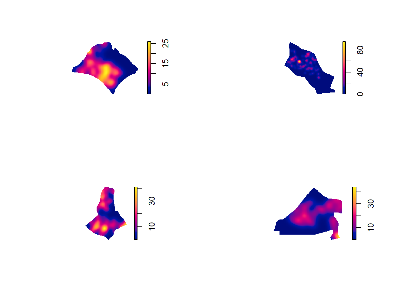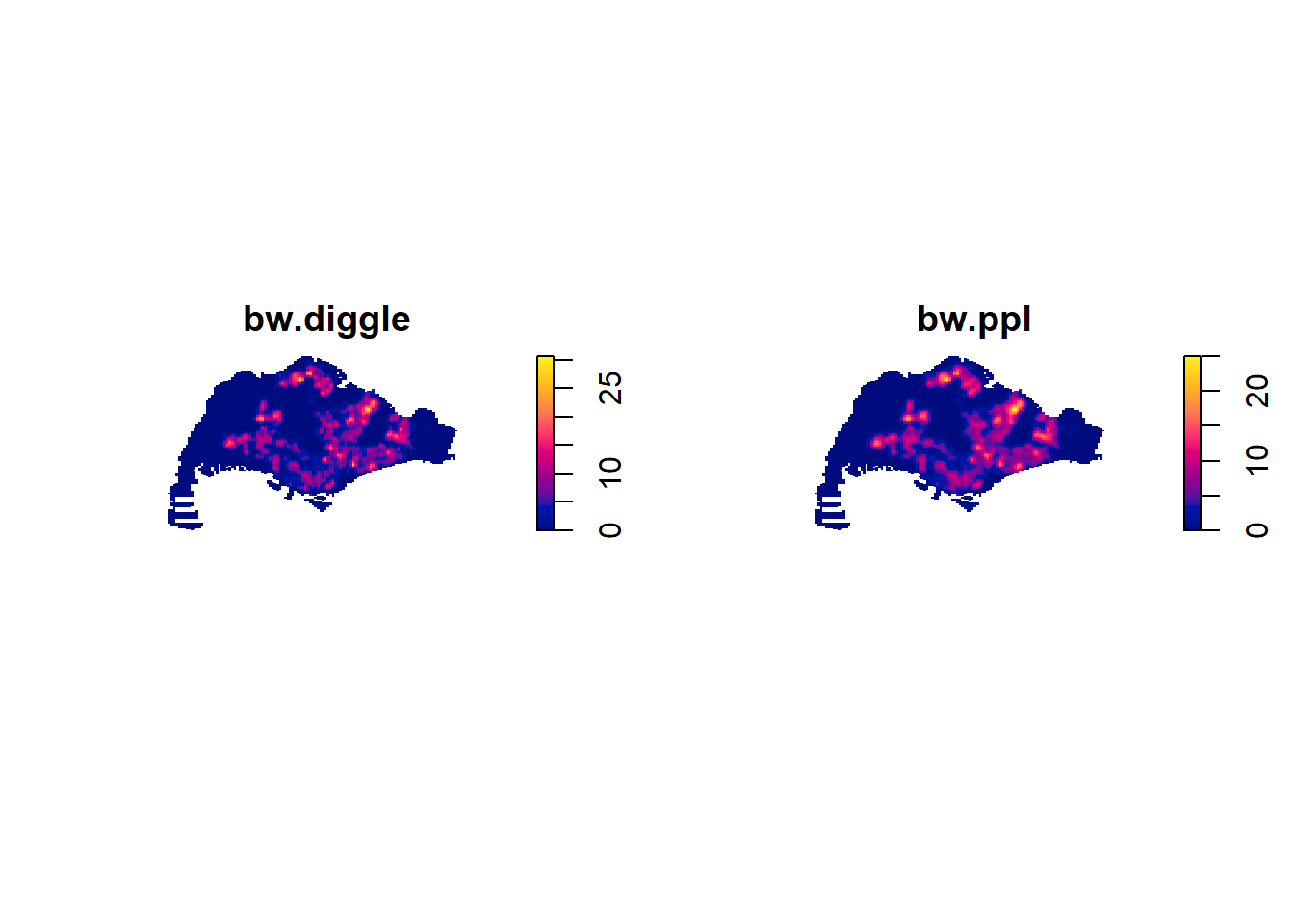 The code chunk below will be used to compute the KDE of these four planning area. bw.diggle method is used to derive the bandwidth of each