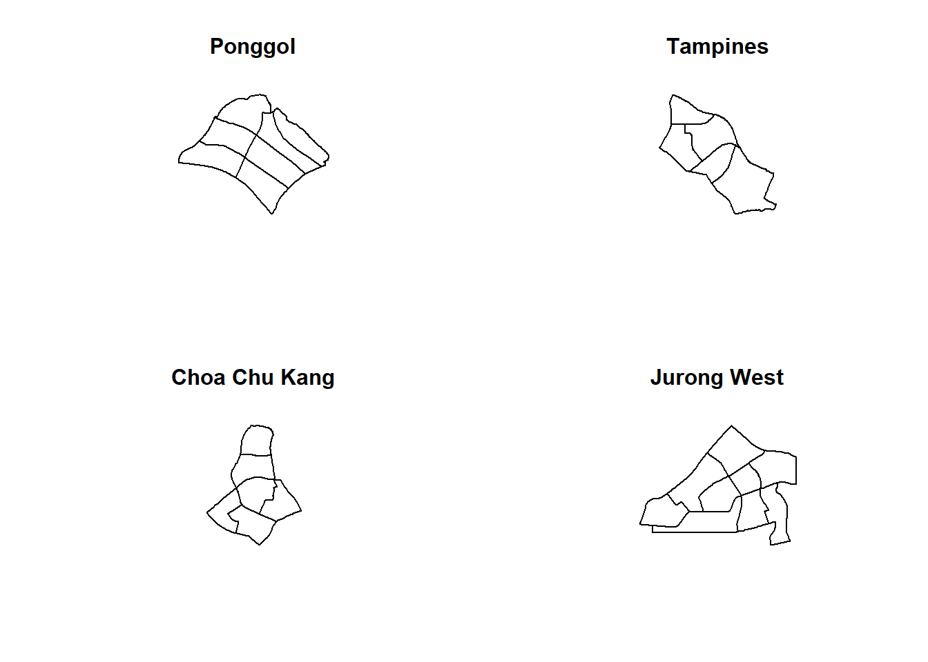 It is always a good practice to review the extracted areas. The code chunk below will be used to plot the extracted planning areas.