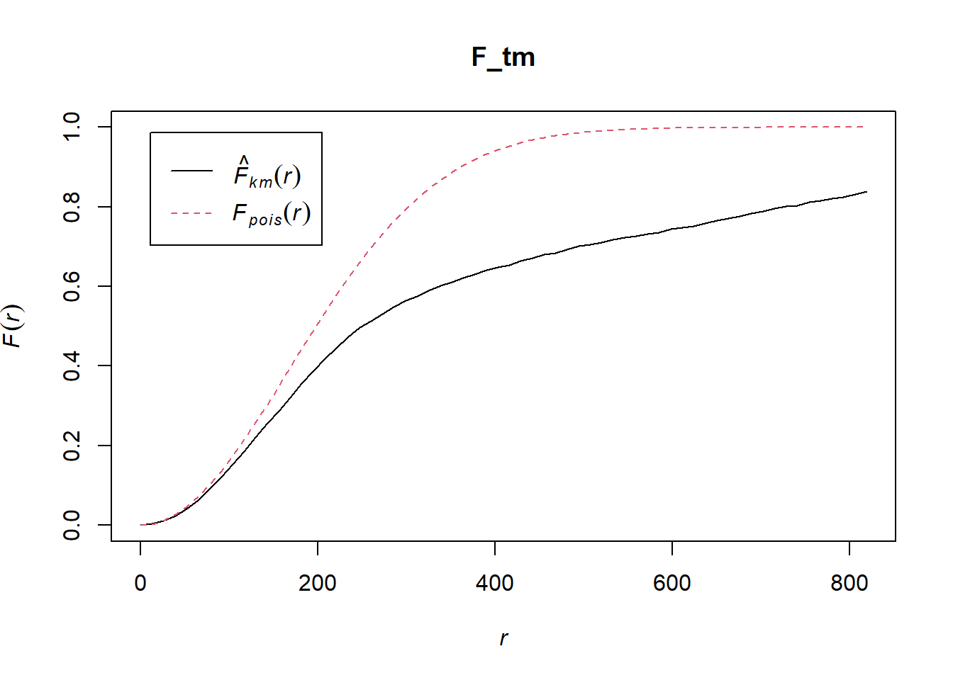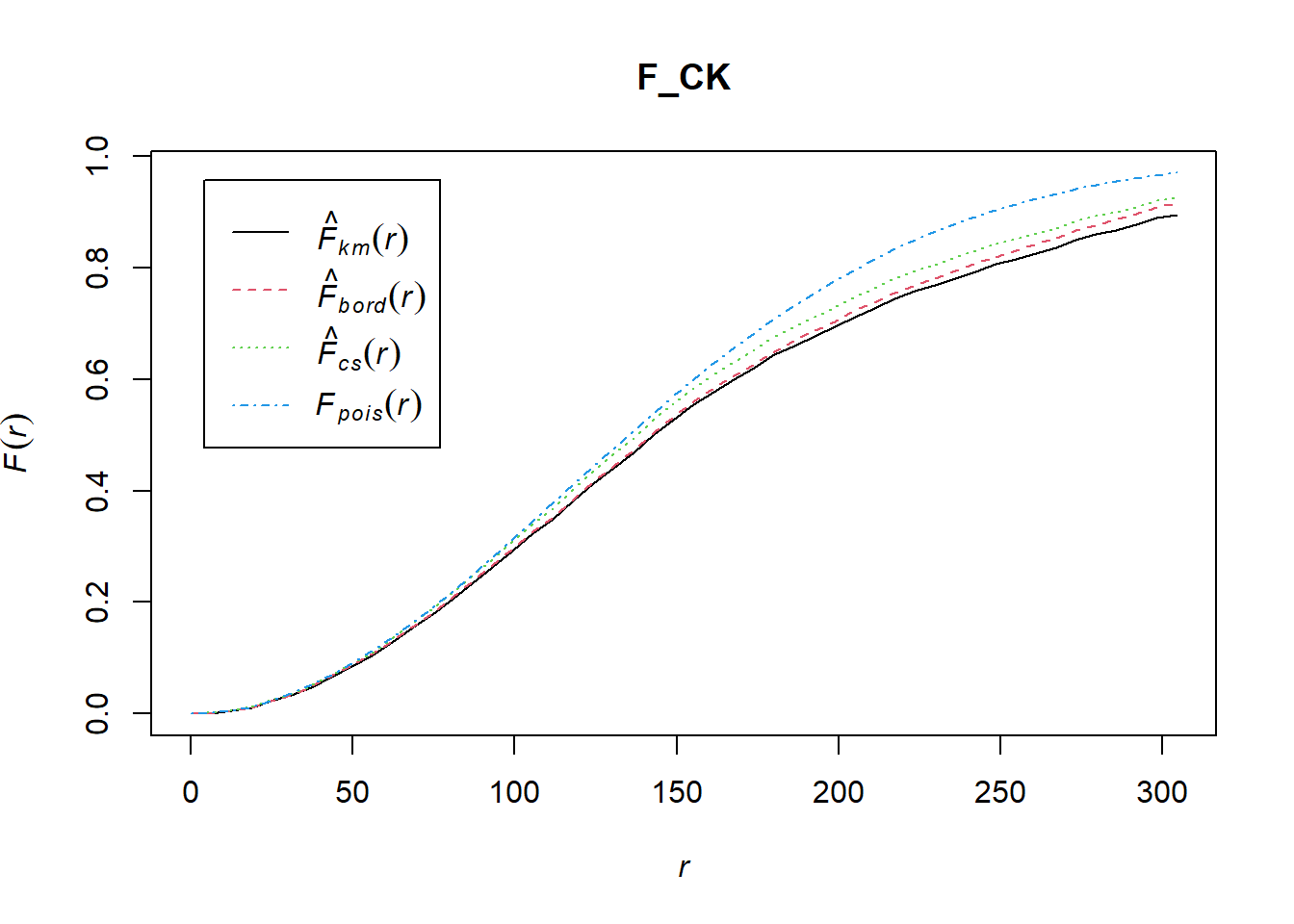 Computing F-function estimation The code chunk below is used to compute F-function using Fest() of spatat package.