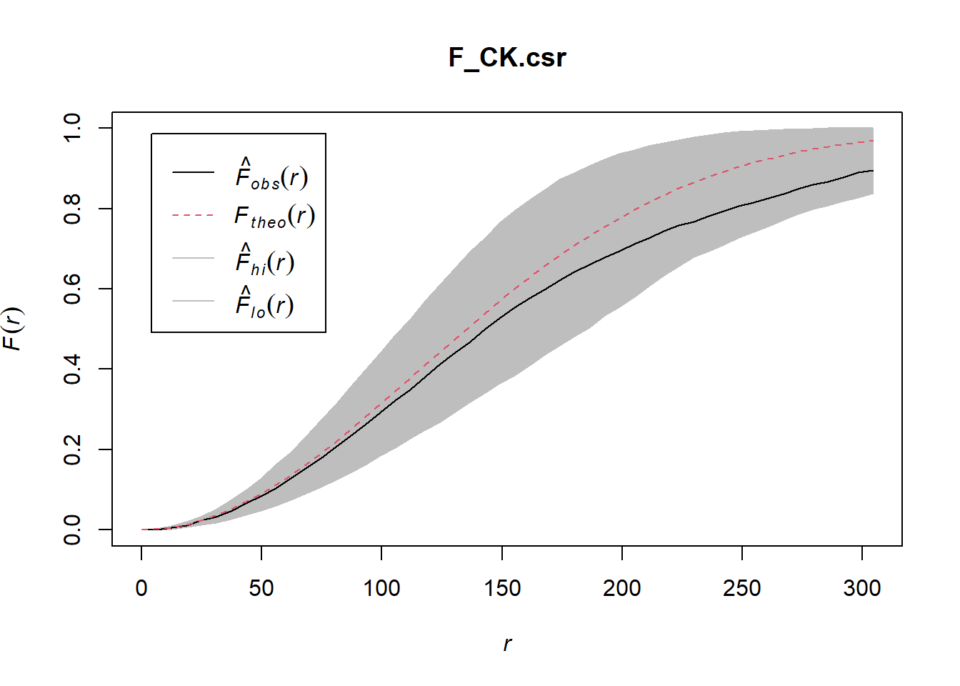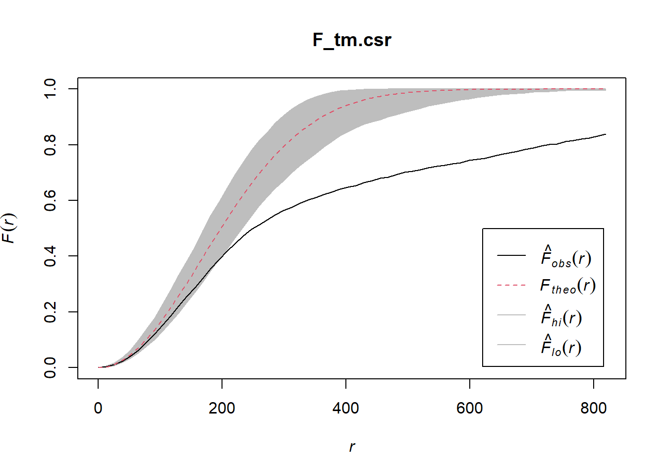 The F function estimates the empty space function F(r) or its hazard rate h(r) from a point pattern in a window of arbitrary shape. In this section, you will learn how to compute F-function estimation by using Fest() of spatstat package. You will also learn how to perform monta carlo simulation test using envelope() of spatstat package.