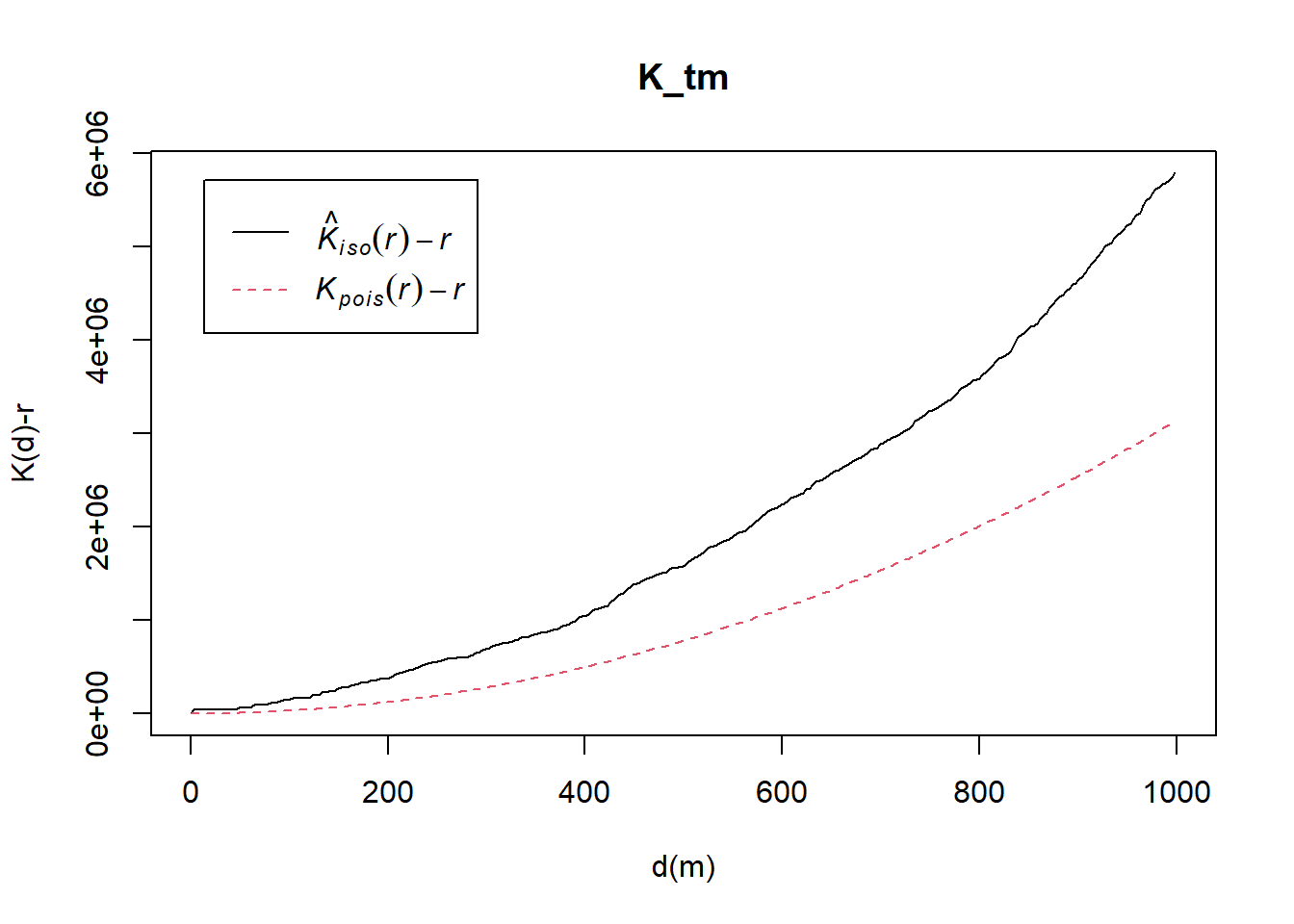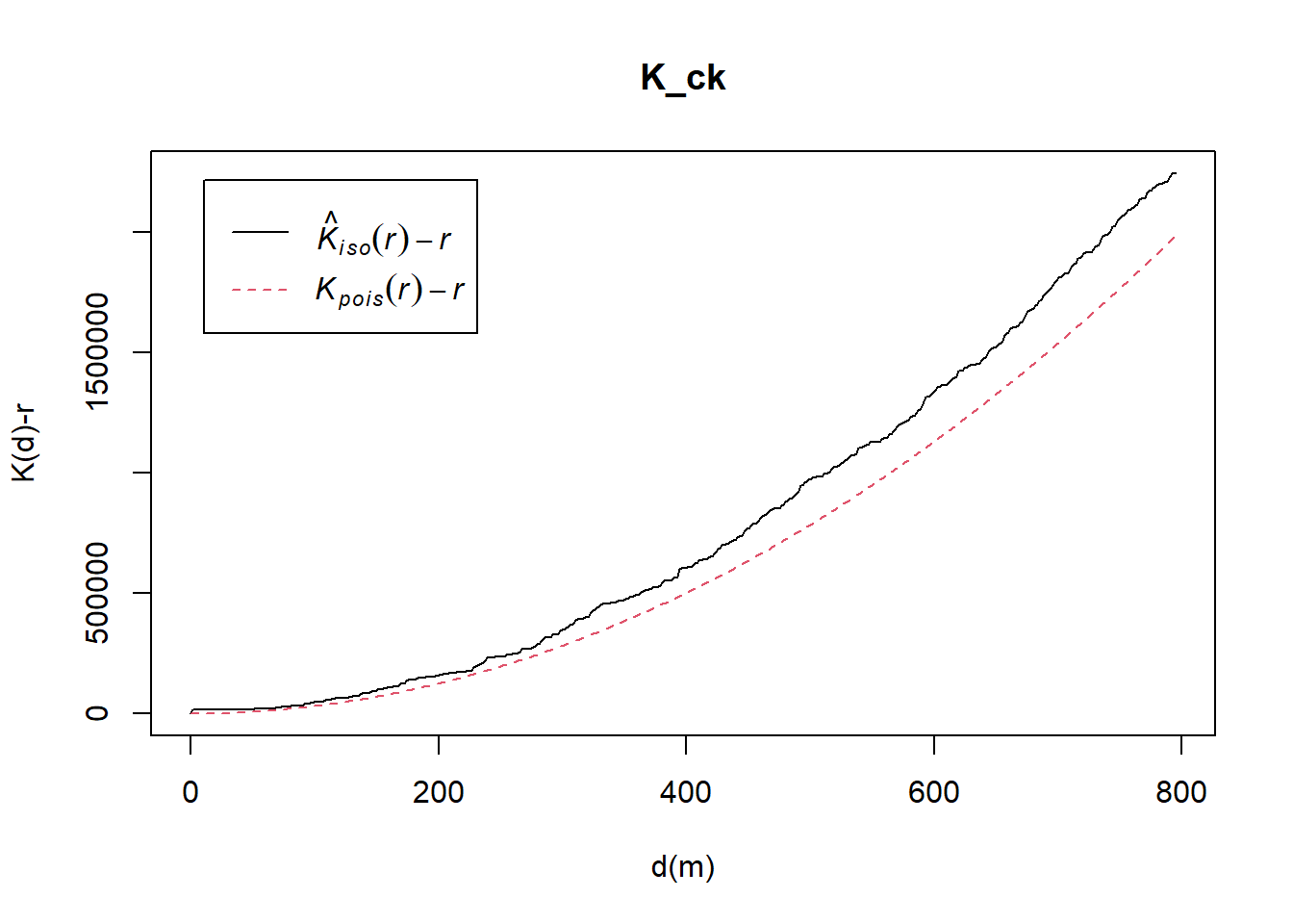 K_ck plot(K_ck, . -r ~ r, ylab= "K(d)-r", xlab = "d(m)")