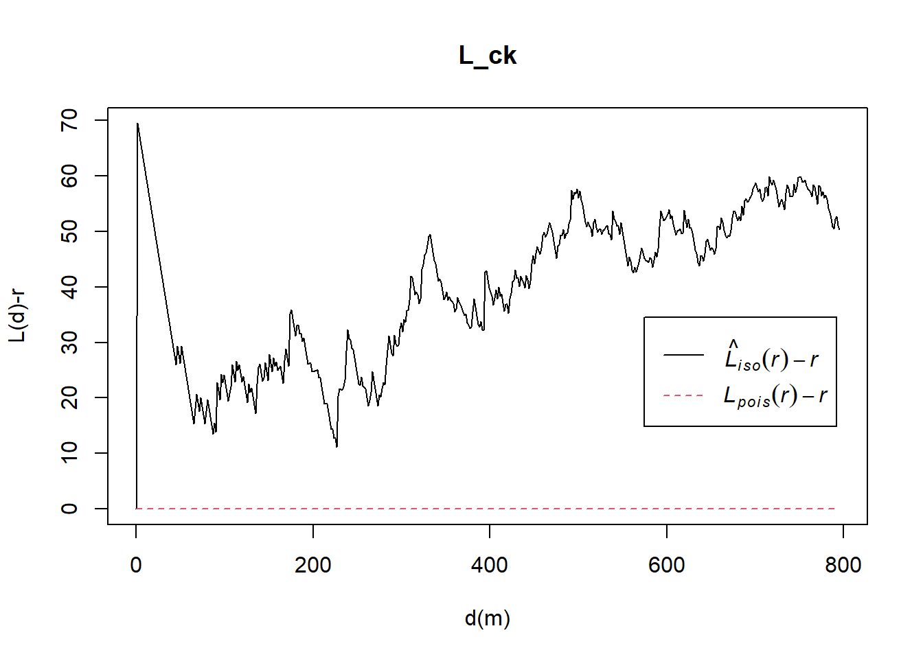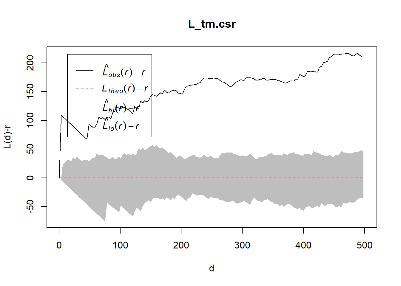 plot(L_ck.csr, . - r ~ r, xlab="d", ylab="L(d)-r")
