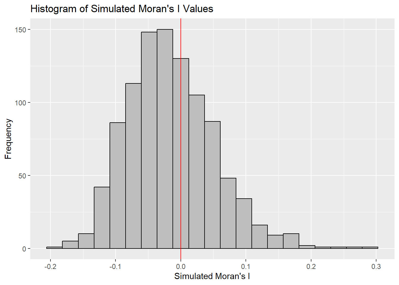 Since the observed Geary’s C value is significantly lower than the bulk of the simulated values and the p-value from the test is very small (p < 0.05), there is strong evidence against the null hypothesis.