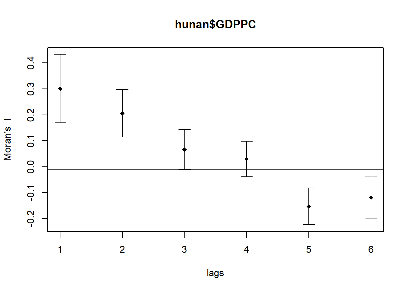 function from the spdep package to compute a 6-lag spatial correlogram for GDP per capita (GDPPC). This function calculates global spatial autocorrelation using Moran’s I. The base R plot() function is then used to visualize the correlogram.