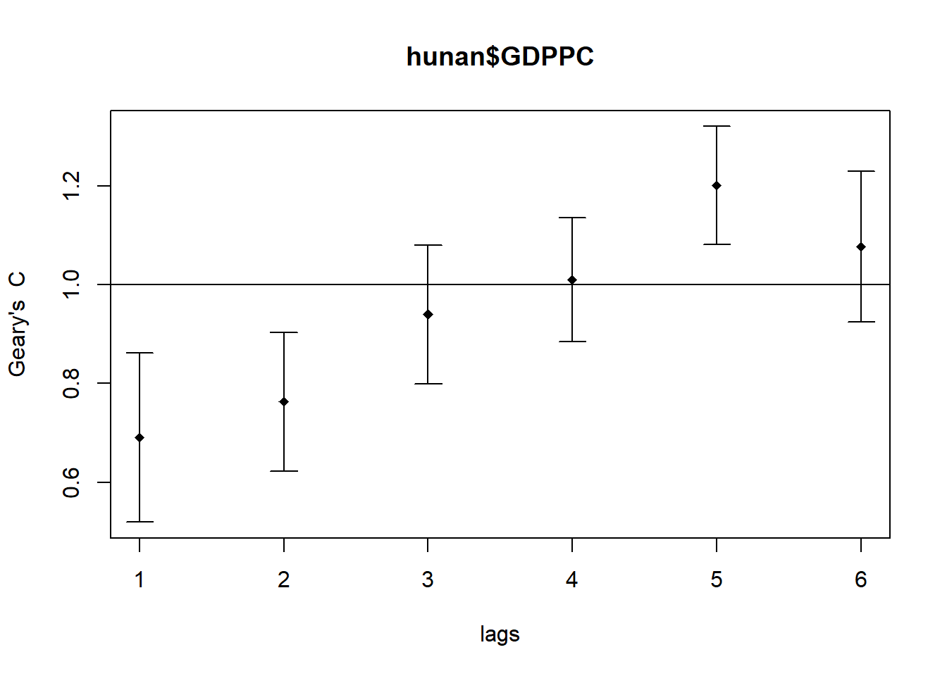 The spatial correlogram using Geary’s C reveals how GDP per capita (GDPPC) values relate across varying distances, helping us understand clustering or dispersion patterns over space.