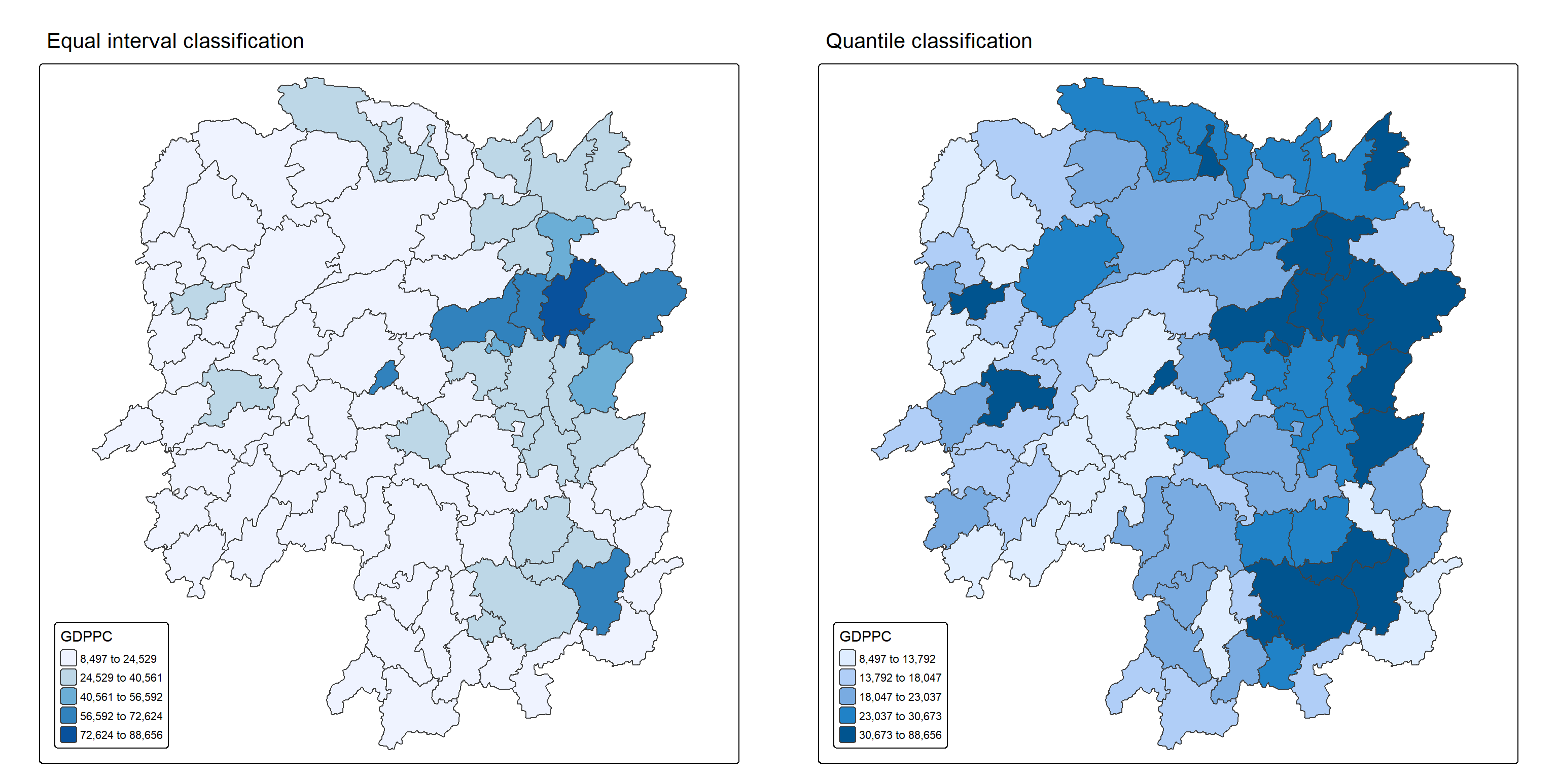 In contrast, the right plot applies equal quantile classification, which divides the 88 counties of Hunan into five groups with roughly 17.6 counties each. This approach is useful for highlighting relative rankings, such as identifying the top 20% of counties by GDPPC. While it ensures balanced representation across classes, it can distort the data’s true distribution—counties with vastly different values may end up in the same class, or similar values may be split across different classes, exaggerating differences that aren’t statistically significant.
