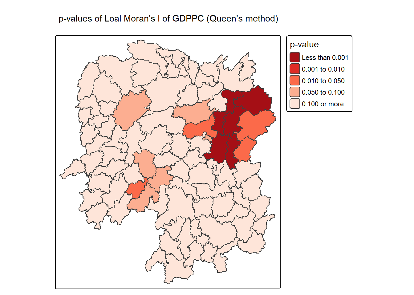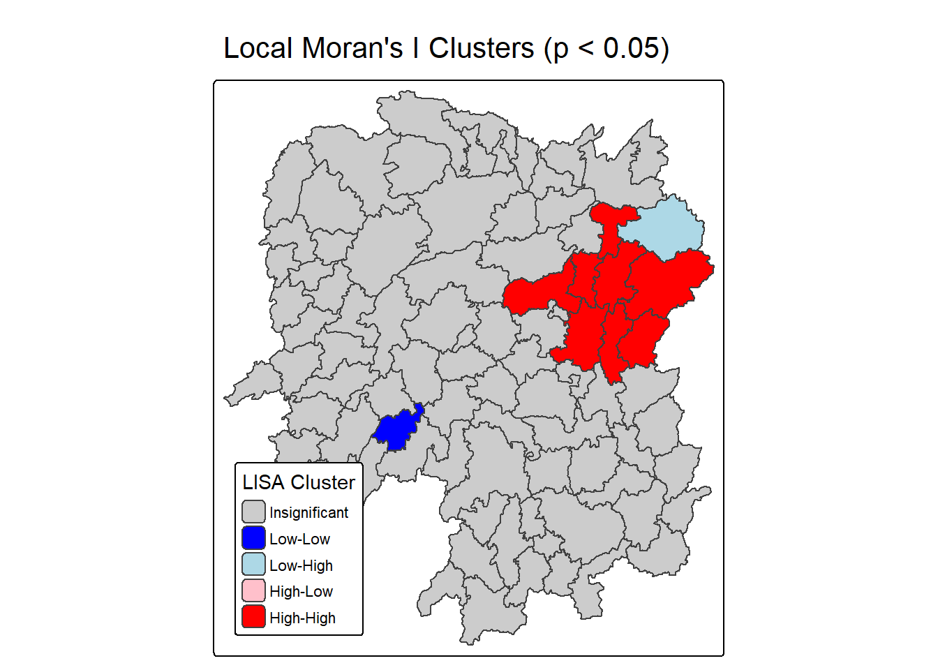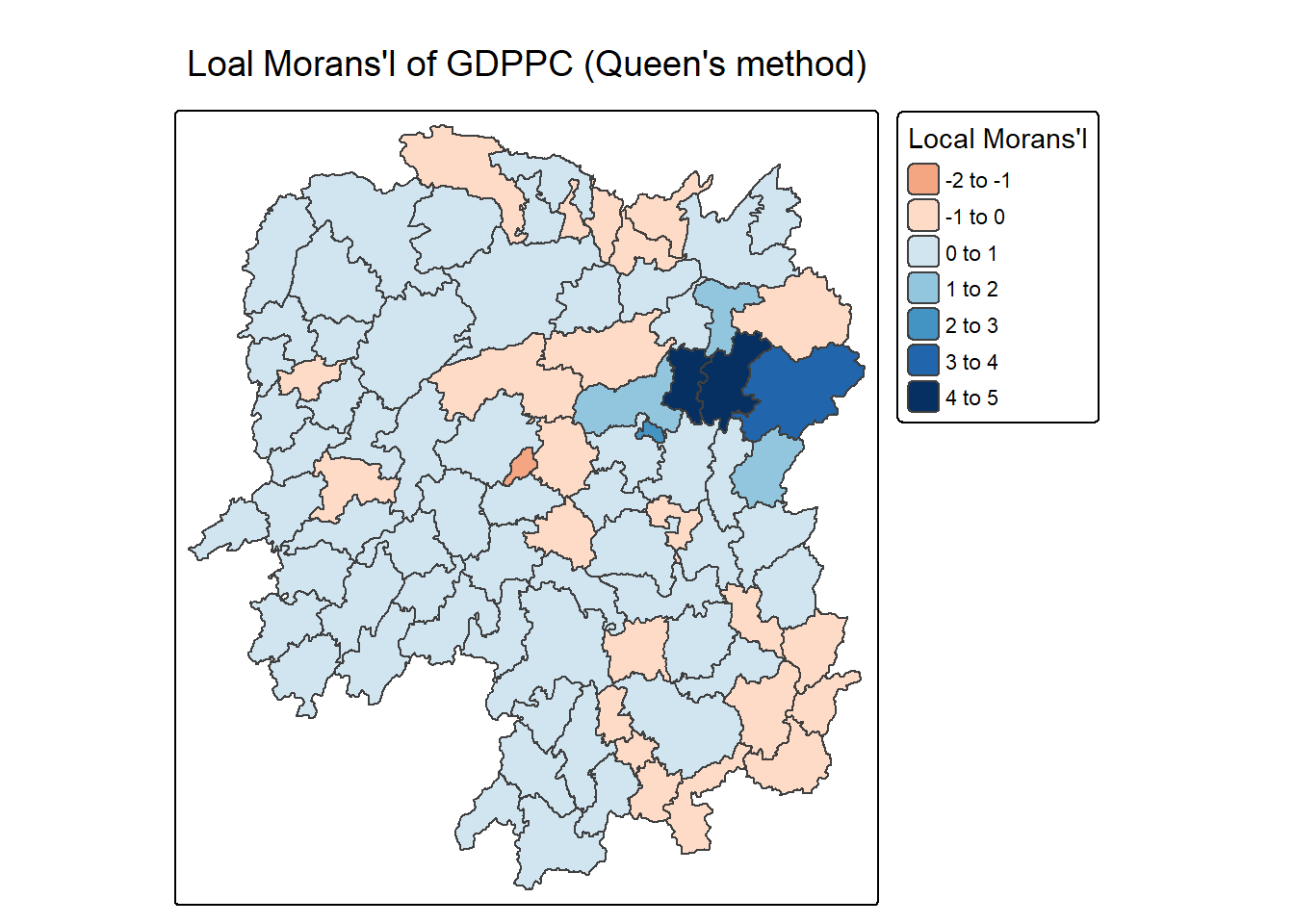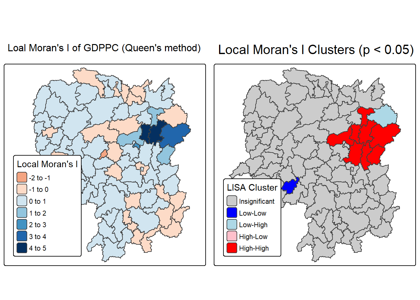 In this section, we will apply appropriate Local Indicators for Spatial Association (LISA), particularly the Local Moran’s I statistic, to identify clusters and outliers in the 2012 GDP per capita data for Hunan Province.
