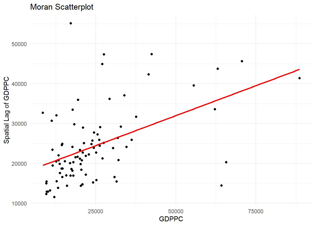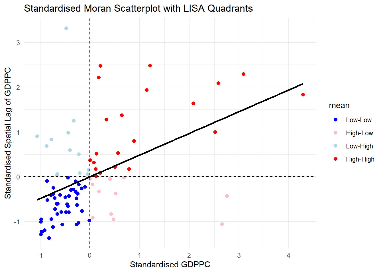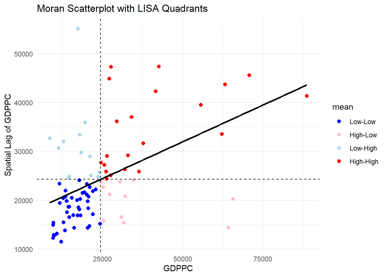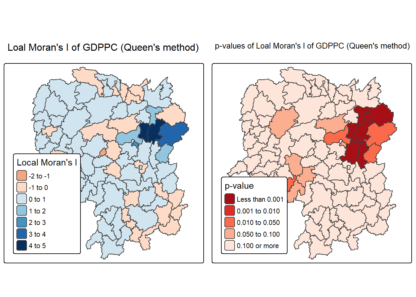 In this section, we will apply appropriate Local Indicators for Spatial Association (LISA), particularly the Local Moran’s I statistic, to identify clusters and outliers in the 2012 GDP per capita data for Hunan Province.