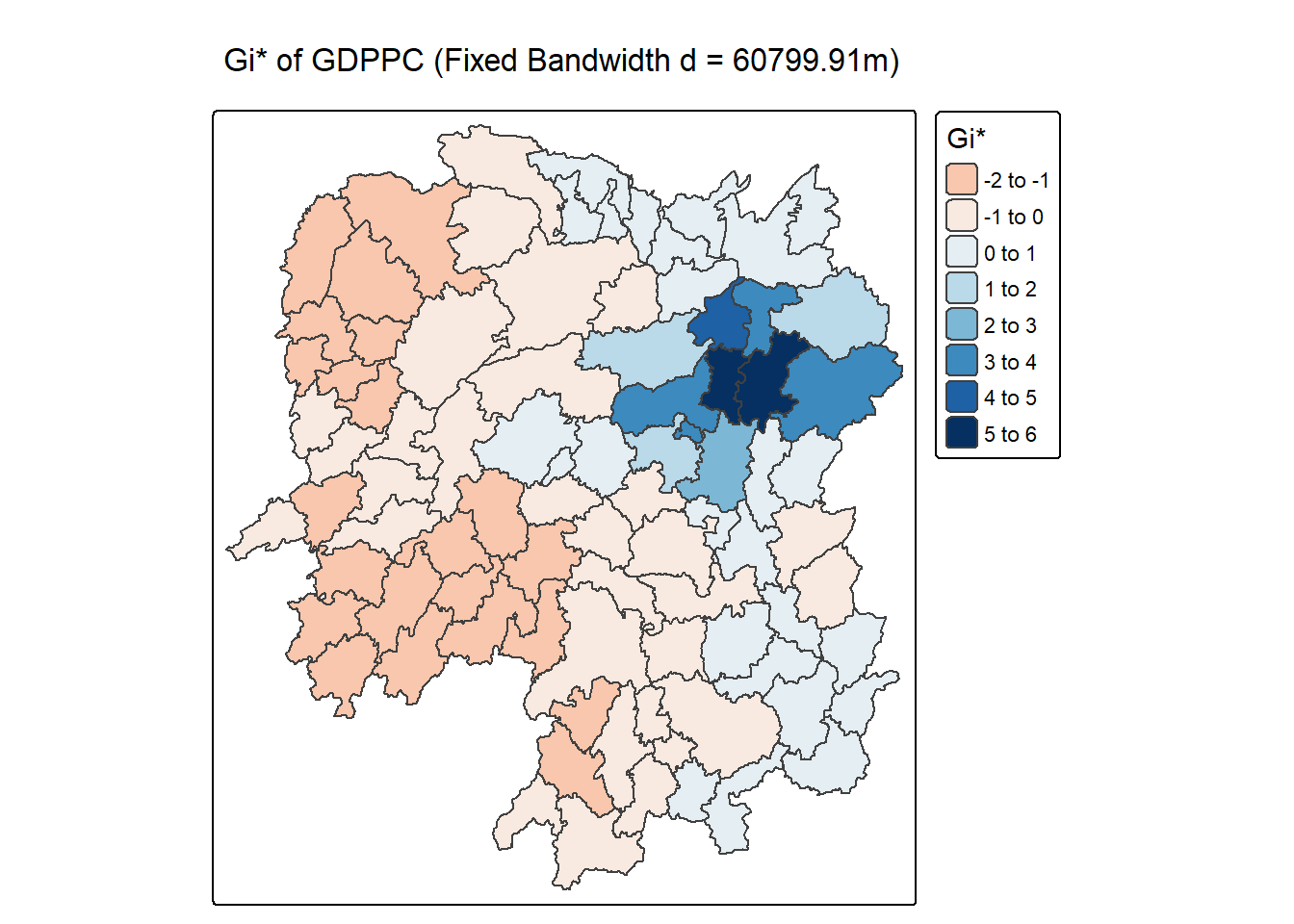 tm_title("Gi* of GDPPC (Fixed Bandwidth d = 60799.91m)")