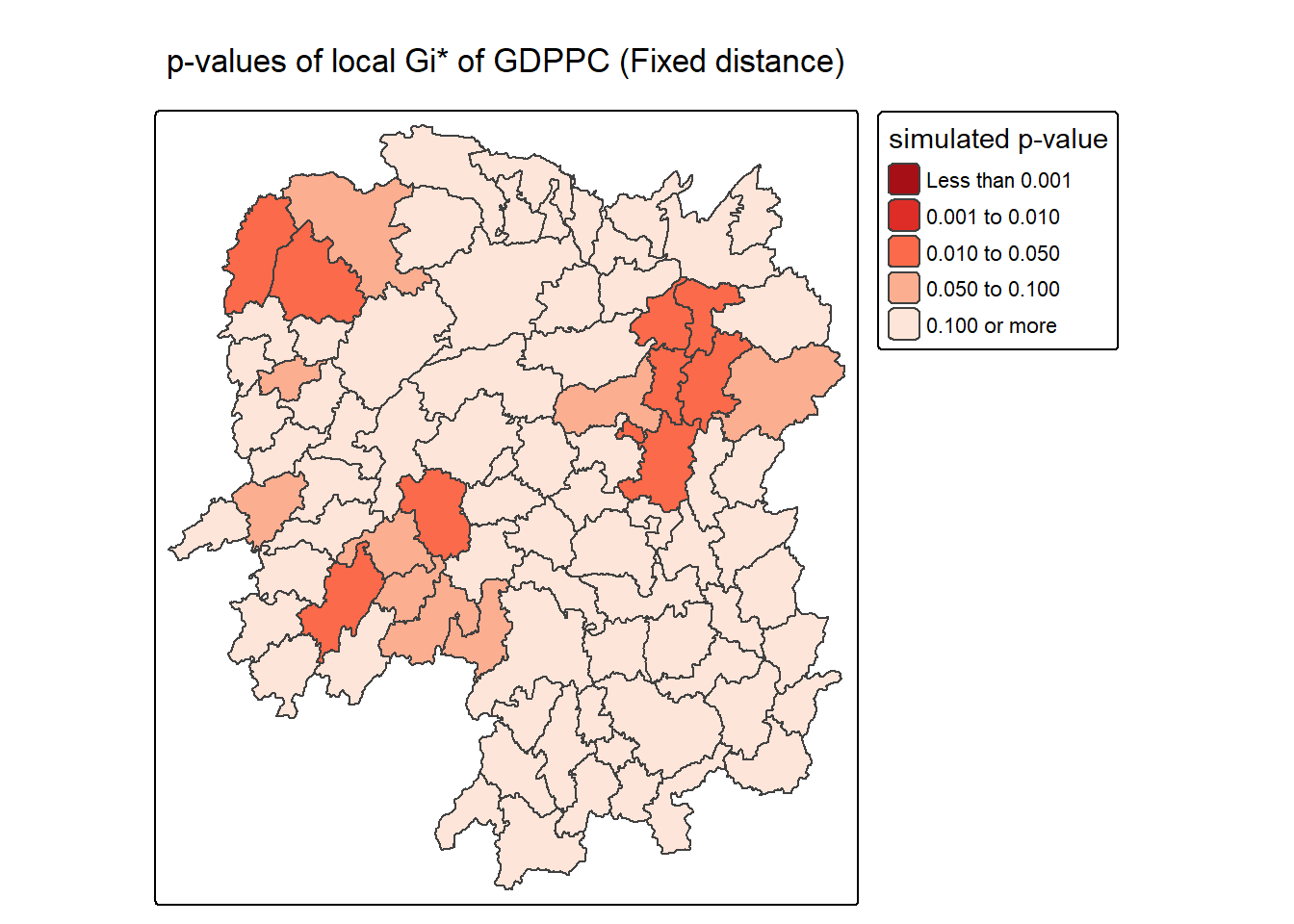 The choropleth map generated by the code visualizes the statistical significance of local Gi* values for GDP per capita (GDPPC) across regions using a fixed distance weight matrix. Each polygon is shaded based on its simulated p-value, which indicates how likely the observed clustering of high or low GDPPC values occurred by chance. Darker shades (e.g., dark red) represent lower p-values, suggesting stronger evidence of significant clustering—either hot spots or cold spots—while lighter shades (e.g., beige) indicate weaker or non-significant clustering.