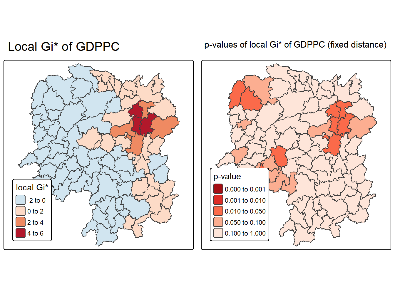 The right map complements this by showing the p-values associated with each Gi* statistic, using a fixed distance weight matrix. Regions shaded in darker reds have lower p-values, indicating stronger statistical significance and higher confidence that the observed clustering is not due to random chance. Lighter shades suggest weaker or non-significant clustering. Together, these maps allow for a more robust interpretation—highlighting not just where clustering occurs, but where it is statistically meaningful.