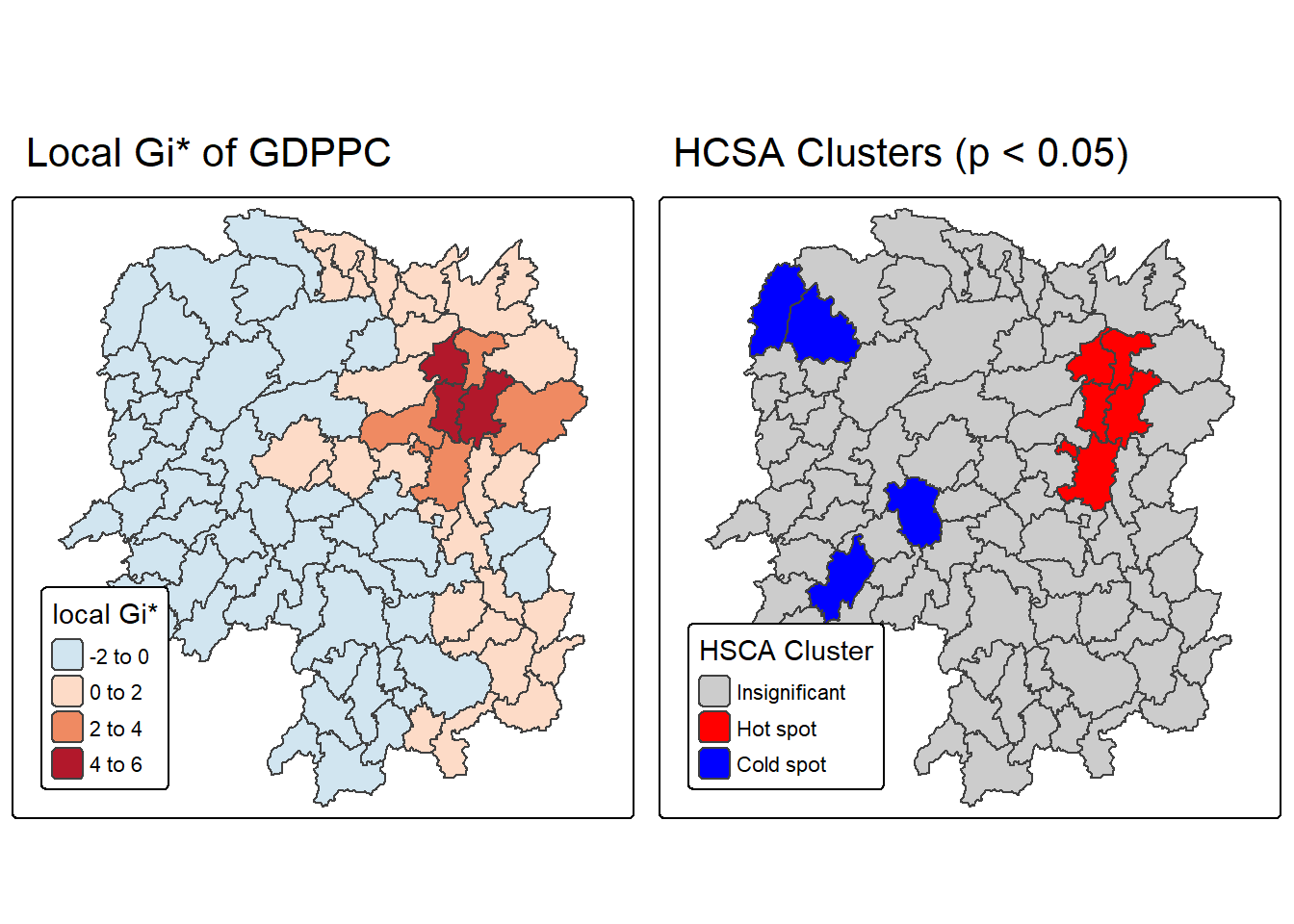 The map generated from the code presents a side-by-side visualization of two key outputs from Hot Spot and Cold Spot Analysis (HCSA) using the Getis-Ord Gi* statistic. This dual-map layout enhances interpretability by combining both the magnitude of spatial clustering (Gi* values) and its statistical significance (HCSA classification).