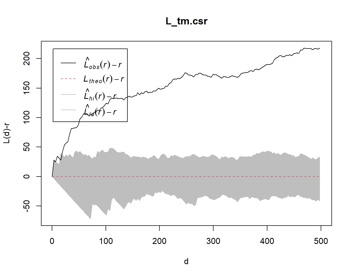xlab="d", ylab="L(d)-r", xlim=c(0,500))
